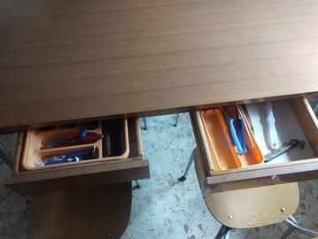 Set Cucina Vintage Anni '60/'70 in Formica – Ottimo Stato Ritiro e smontaggio a Vs. Carico. Si trova a un piano terra a Porto Valtravaglia (va) E' composto da una capiente credenza, tavolo con cassetti e 6 sedie, tutto in formica effetto legno, materiale iconico dell'epoca per resistenza e facilità di pulizia. -Grande Credenza Buffet Dimensioni: 1,95 m (larghezza) x 1,90 m (altezza). Un mobile versatile e molto funzionale, perfetto per organizzare stoviglie e piccoli elettrodomestici. Composta da una parte superiore con ante a battente e ripiani interni, un ampio piano d'appoggio centrale e una base con cassetti e ulteriori vani contenitori. Interni bianchi pulitissimi, cerniere e maniglie originali dell'epoca. - Tavolo da Cucina "Fratino" Classico tavolo da famiglia, solido e pratico, con il caratteristico bordo scuro e gambe in metallo. Dimensioni: 1,40 m x 75 cm. Dotato di due cassetti laterali - Set di 6 Sedie Coordinate Sedie con struttura tubolare in metallo cromato/satinato e seduta/schienale in formica. Linee essenziali e pulite, tipiche del design industriale dell'epoca.