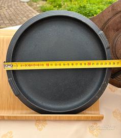 Splendido set da portata composto da una piastra circolare in vera ghisa pesante e una base protettiva in legno massiccio sagomato. Ideale per servire in tavola carne, grigliate, fajitas o verdure mantenendo il calore per tutta la durata del pasto. Dettagli del prodotto: • Materiale: Ghisa di alta qualità (ottima inerzia termica) e legno resistente. • Dimensioni Piastra: Diametro esterno 27 cm (superficie utile 24 cm). • Dimensioni Base Legno: Lunghezza totale circa 35 cm con manici ergonomici. • Stato: Ottime condizioni vintage, struttura solida e senza difetti. OFFERTA MULTIPLA (Sconti Quantità) Dispongo di diversi pezzi uguali, perfetti per cene numerose, regali o per attività come agriturismi e bracerie. • 1 Set: 35 € • 2 Set: 60 € (Risparmi 10 €) • 4 Set: 110 € (Risparmi 30 €) • 6 Set: 150 € (Sconto Speciale: solo 25 € l'uno!) Se desideri più di un pezzo, contattami in privato: creerò un annuncio personalizzato per farti risparmiare sulle spese di spedizione!