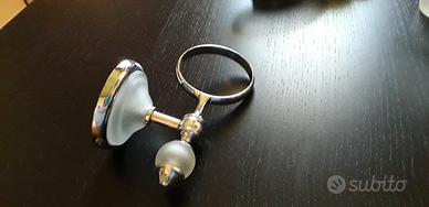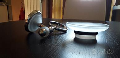 Vendo set da bagno porta spazzolini e porta sapone da appendere a parete o da appoggio sul lavabo, comprensivo di 2 supporti in acciaio cromato con inserti in vetro satinato da parete e 1 porta sapone e 1 porta spazzolini provvisti di guarnizione per appoggiarli sui supporti in modo che aderiscano e stiano ben fermi.