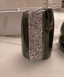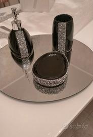 Nuovi, dispenser, porta sapone e bicchiere per spazzolini e dentifricio, in ceramica nera lucida con decoro di brillantini
