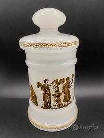 Set da bagno in vetro opalino decorato con decalcomanie oro in stile neoclassico. Misure 15x8