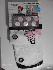 Un set da bagno nuovo ancora nella sua confezione originale di 14 pezzi a tema Minnie Mouse, che include un tappeto rotondo da bagno antiscivolo bianco e nero, una tenda da doccia con motivi di Minnie Mouse, il design presenta Minnie Mouse in diverse pose su uno sfondo bianco con pois , e 12 ganci per tenda da doccia. Il tappeto rotondo ha un diametro di 63,5 cm. e la tenda da doccia misura 178 cm. di larghezza e 183 cm. di altezza. Il tappeto è stampato su tessuto 100% cotone, la tenda da doccia è realizzata di poliestere in microfibra.