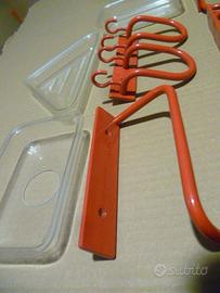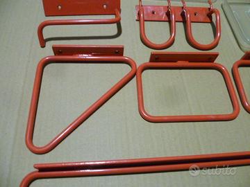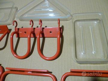Set composto da 9 pezzi, 6 in ferro pesante verniciato rosso e 3 ciotoline in PVC trasparente porta sapone: sono degli anni '80 ed ancora in ottimo stato di conservazione. Il più lungo misura cm 45.