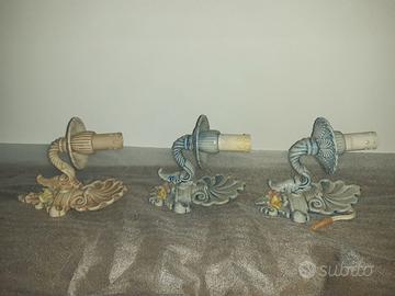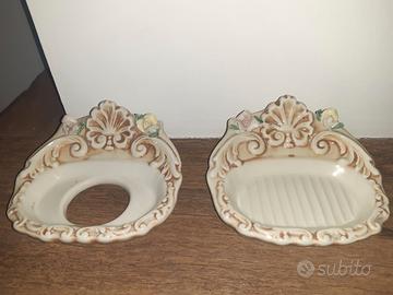Set da bagno in ceramica con roselline tipo Capodimonte composto da specchio, lampadario e 3 appliques, porta sapone lavandino e porta sapone vasca, n. 2 porta asciugamano. La ceramica è integra e senza difetti. La spedizione non è attuabile vista la delicatezza degli oggetti. Solo ritiro di persona zona Ancona e provincia.