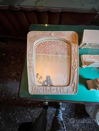Bellissimo e in buonissimi condizioni set da bagno vintage. Comprende 1 specchio ,1lampadario ,1 porta carta igienica,1porta saponetta ,2 appendi accappatoi e 1 appendi asciugamani di cui manca solo un pezzo di quest’ultimo per qualsiasi informazione scrivatemi