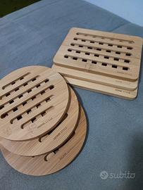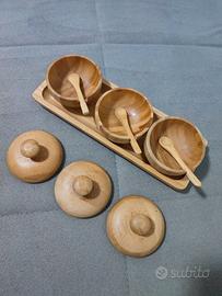 Bellissimo set da Bambù, con finitura delicatamente liscia, senza nessun marchio o difetto, è stato comprato e tenuto dentro armadietto, mai usato.
