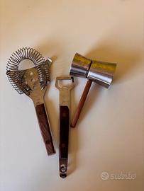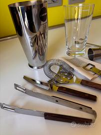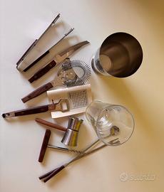 Set da bar ‘Alessi by appointment’ originale composto da vari pezzi misti, ideale per collezionisti, amanti del vintage o per creare un angolo cocktail completo. Realizzato in lega di acciaio inossidabile di alta qualità giapponese e legno. Design elegante e raffinato. Shaker Alessi in acciaio e vetro Strainer/colino professionale Jigger/dosatore Pinza per il ghiaccio Apribottiglie Cavatappi Coltello per frutta Cucchiaio e forchetta da bar Numero di pezzi: 10 Condizioni ottime, normali segni del tempo. Tutto come da foto.