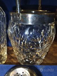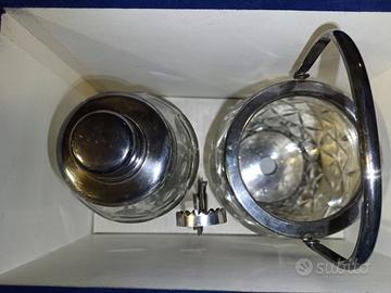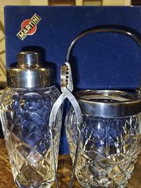 Set shaker per cocktail e secchiello per il ghiaccio in meraviglioso cristallo di boemia molato vanni '60. Lo shaker per cocktail e il secchiello per il ghiaccio sono realizzati in cristallo di altissima qualità. Le parti metalliche sono placcate in argento. Splendidi accessori da bar. SHAKER: Altezza: 22cm SECCHIELLO DEL GHIACCIO: Altezza: 15 cm Diametro della bocca : 9 cm PINZA PER GHIACCIO. PESO TOTALE: 2,2 kg circa. CONDIZIONI: ottime condizioni vintage. Nessuna scheggiatura o crepa, nessun danno. Argento ossidato dal tempo. Nuovo mai usato, nella scatola originale. La scatola è rovinata sono presenti alcune macchie e alcuni strappi.