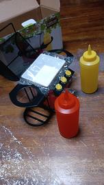 Set condimento per barbecue con due contenitori per salse, due per sale e pepe e piccola bacinella, il tutto incastonato in un supporto a forma di barbecue molto carino da tenere comodamente in cucina. Anche idea regalo. Nuovo ancora imballato