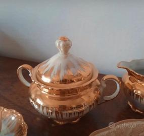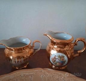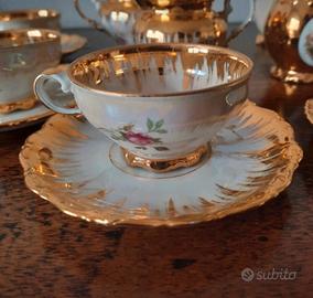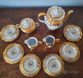 Set da caffè/the della marca Seltmann Weiden con motivo florele e rifiniture color oro. Contiene 6 tazzine da caffè con i loro 6 piattini, una zuccheriera, una teiera e due lattiere.