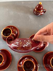 Vendo elegante set da caffè in porcellana francese, colore rosso bordeaux con decorazioni floreali bianche e oro.