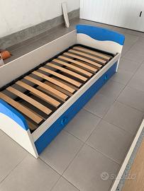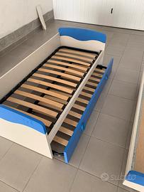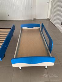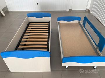 •Il letto a destra è dotato di una sponda laterale blu, utile per evitare cadute, rendendolo adatto anche a bambini piccoli.