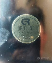 Delizioso set da colazione (latte & zucchero) in acciaio e oro 24 Kt del gruppo Oroten Ronchi. Il set è composto da sottopiatto (misure 28 cm X 16 cm), lattiera e zuccheriera con coperchietto (entrambe alte 6 cm, capacità max 20 cl). Un oggetto stupendo sia da usare sia da ammirare! E per chi acquisterà questo oggetto, in regalo un simpatico set sale e pepe!