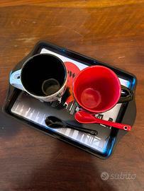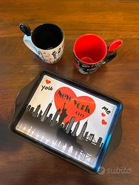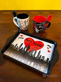 Set da colazione New York composto da due tazzine in ceramica con cucchiaino e vassoio metallico.