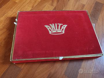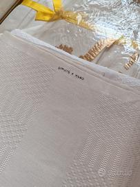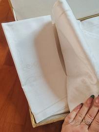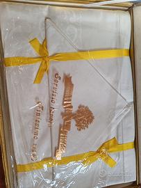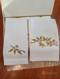 Set artigianale composto da: 2 asciugamani, tovaglia, 6 tovaglioli in cotone. Mai aperto e mai utilizzato, ancora nella scatola originale, fatto a mano. Regalo di nozze