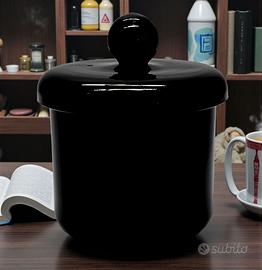 Set da cucina per colazione composto da: una caraffa per latte in vetro soffiato a bocca smaltata nera altezza 23 x diametro 10,8 cm e un barattolo con coperchio altezza 13,5 x diametro 11,7 cm in vetro soffiato a bocca e smaltato nero per contenere il burro. Sotto al contenitore porta l’etichetta del maestro vetraio Archimede Seguso (Murano 17 dicembre 1909 – Murano 6 settembre 1999). Breve storia: Archimede Seguso, maestro vetraio, in connubio con la genialità del designer, viene riconosciuta a livello internazionale. Gli anni Cinquanta rappresentano per lui anni di ricerca e innovazione. Diverse opere sono conservati nei più importanti musei nel mondo