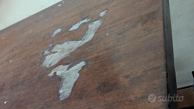 Tavolo: Ampio piano (8 posti), struttura molto stabile. Presenta una leggera sbrasatura superficiale in un punto del piano dovuta al calore, facilmente risolvibile con una passata di carta vetrata e olio protettivo.
