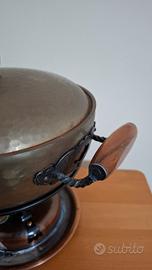 Set da fonduta, Pentola In Rame Martellato con coperchio, manici e pomello in legno altezza 25cm larga 34cm Completa Di Fornello a spirito.
