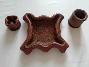 Set da fumo vintage, 3 pezzi, in vero cuoio rigido modellato, composto da posacenere, porta fiammiferi e porta sigarette. Nuovo da campionario.