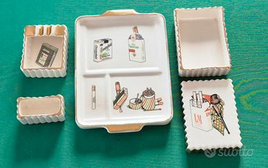 Vendo set da fumo vintage anni '60 in ceramica smaltata con finiture dorate sui bordi a coste, composto da cinque pezzi. I pezzi includono posacenere e porta-sigarette, e sono decorati con illustrazioni di pacchetti di sigarette d'epoca di marchi noti come Chesterfield, Stuyvesant e L&M, con rifiniture dorate sui bordi a coste.