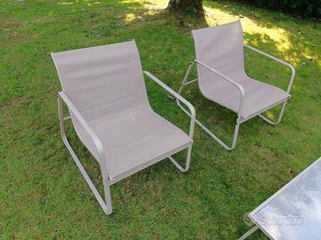 Struttura in ferro con finitura opaca color sabbia, materiale seduta textilene colore sabbia.
