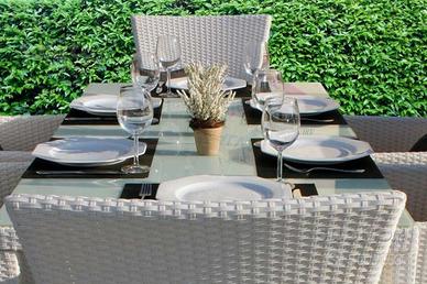 Comodo ed elegante set da giardino composto da un tavolo con il piano in vetro, 6 sedie e cuscini estraibili. Lo speciale materiale in rattan plastificato lo rende leggero e facilissimo da trasportare.