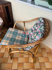 4 sedie con tavolino in vimini con incluso set di cuscini e tovagliette. Condizioni ottimali,restaurati recentemente.
