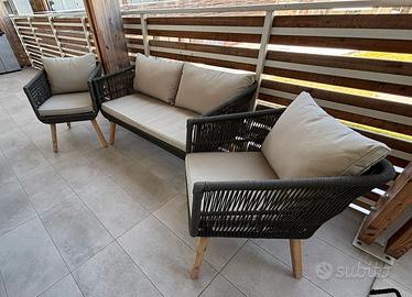 🌿 Set da esterno Kave Home INTI – Divano 2 posti + 2 poltrone Vendo set da giardino originale Kave Home – modello INTI, composto da: ✅ 1 divano a 2 posti ✅ 2 poltrone ✅ Cuscini originali inclusi Il set è ancora in vendita nuovo sul sito Kave Home (modello INTI), realizzato in corda verde con struttura in legno certificato FSC® 100%, design moderno ed elegante. 📌 Condizioni La struttura è in ottimo stato, solida e senza difetti. I cuscini originali sono inclusi e presentano un leggero scolorimento dovuto all’esposizione al sole, visibile dalle foto, motivo del prezzo ridotto rispetto al nuovo. Perfettamente utilizzabili e comodi. 🎨 Materiali e stile Intreccio in corda sintetica verde Gambe in legno FSC® Cuscini chiari, removibili Ideale per terrazzi, balconi o giardini coperti. 💶 Prezzo 549 € Prezzo di listino nuovo 985 € Possibilità di leggera trattativa. 📍 Ritiro Pavia – comodo anche per chi arriva da Milano e hinterland. Ritiro a mano, non spedisco. 📩 Per informazioni o per vederlo dal vivo, contattarmi tramite chat Subito.
