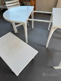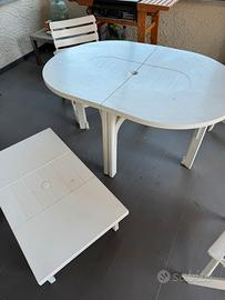 Si vende set da giardino bianco composto da un tavolo allungabile Aliberti, 4 sedie pieghevoli Omsi e una poltrona reclinabile in 5 posizioni e anch’essa pieghevole.