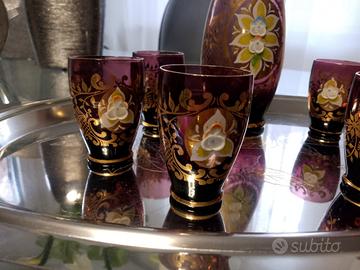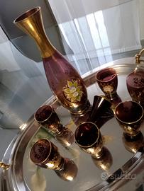 set da liquore vetro di murano con finiture in oro e gigli in ceramica di decorazione composto da ampolla e 6 bicchieri