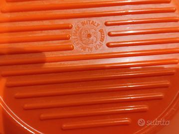 Set da Pic nic " Pic Boll" Guzzini by Carlo Viglino anni 60 e 70 rosso. È dotato di un portaoggetti in plastica a forma di sfera, che può essere usato come insalatiera, dove c'è il necessario per un picnic per 6 persone, cioè : un vassoio, 6 piatti piani, 6 piatti fondi, 6 piatti da dessert, sei bicchieri un contenitore per Sale e Pepe un contenitore per olio e aceto.