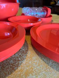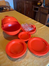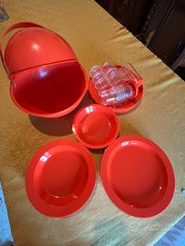 Componenti: contenitore Boll con manico con all'interno un set di bicchieri, piatti fondi, piatti pari e piattini fondi in plastica molto resistente.