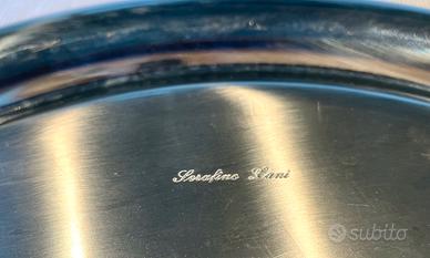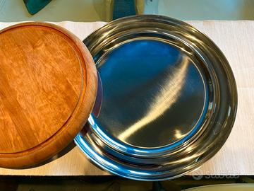 Set di portata per formaggi in acciaio e legno ontano Serafino Zani. Comprende vassoio e cupola in acciaio con pomolo in legno e tagliere in legno di ontano. Misure: diametro vassoio cm.34,5 diametro tagliere cm.30 altezza complessiva 17 cm. In ottimo stato di conservazione, qualche piccolissimo segno nel retro del vassoio
