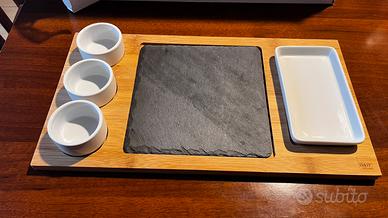Set ardesia, bomboo e porcellana per sushi e altro. Marca H&H. Set composto da 3 ciotole, 1 vassoio medio e un piatto in ardesia. Mai usato.