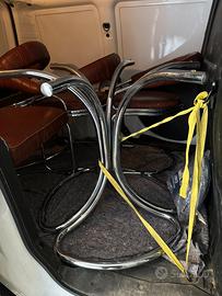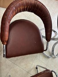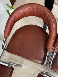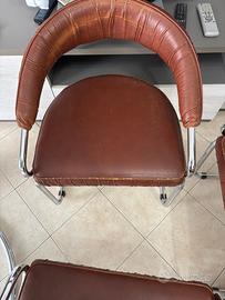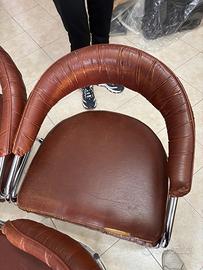 Set da pranzo vintage Giotto Stoppino per Kartell – Tavolo in cristallo fumé con 4 sedie in pelle e acciaio cromatoIcona del design italiano degli anni '70, questo raro set da pranzo progettato da Giotto Stoppino per Kartell unisce eleganza minimalista e materiali innovativi. Il tavolo presenta un piano in cristallo fumé (vetro temperato smoked) di spessore generoso, sostenuto da una struttura tubolare in acciaio cromato che conferisce leggerezza e stabilità. Le quattro sedie, con struttura in acciaio cromato lucido e imbottitura in pelle tabacco di alta qualità, offrono comfort ergonomico e un contrasto sofisticato con il piano fumé.Condizioni eccellenti: il set è vissuto ma in buone condizioni generali. La pelle delle sedie presenta leggera usura, una ha un piccolo foro, l’altra un taglio vicino alla cucitura. L'acciaio cromato presenta solo piccoli segni di usura superficiali, tipici dell'età, che non compromettono l'estetica complessiva. Il cristallo fumé è integro, senza scheggiature o graffi profondi.Dimensioni:Tavolo: circa 130 cm di diametro, altezza 73-75 cm (standard per dining table vintage con smoked glass). Sedie: altezza totale 76 cm, larghezza 61 cm, profondità 54 cm, altezza seduta 46 cm, altezza braccioli 65 cm.
