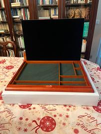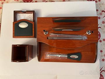 Composto da: scrittoio apribile; porta penne; 1 pezzo formato da porta lettere, porta documenti e porta penne; porta foglietti per appunti; taglierino; 2 penne.