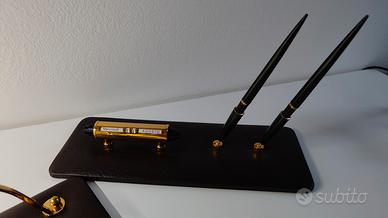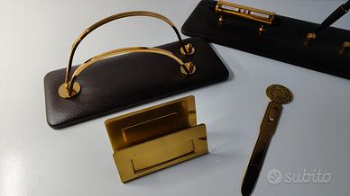 VENDO set da scrivania vintage in metallo color ottone con basi in similpelle. Mai utilizzato, in perfette condizioni come da foto.