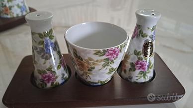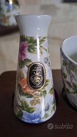 Set porta condimenti in ceramica di alta qualità con raffinata decorazione floreale artigianale e design compatto e funzionale. Perfetto per apparecchiare una tavola elegante. Comprende: 2 oliere di cm.20 di H.; 2 saliere cm.10; 1 salsiera e i relativi vassoi in legno. Mai usato