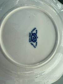 Porcellana fine decorata in blu cobalto con motivi floreali e bordature dorate a mano.