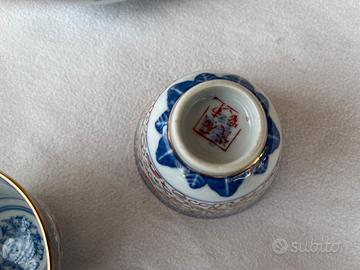 8 tazze abbinate, con interno blu decorato con draghi e bordo dorato