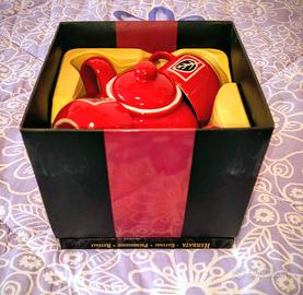 🎁 Elegante set da tè in ceramica rossa composto da teiera con coperchio, due tazze e due piattini coordinati, tutti decorati con un raffinato motivo foglia stilizzata su fondo nero.
