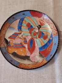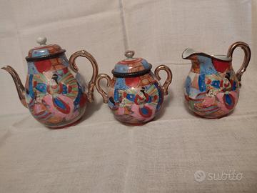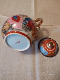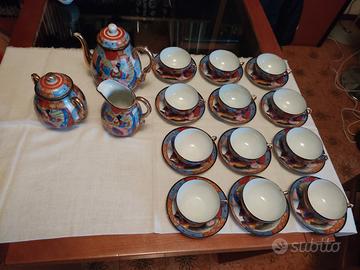 Il set è composto da 27 pezzi, 12 piattini, 12 tazze, 1 lattiera, 1 zuccheriera, 1 teiera. Tutti i pezzi sono in ottimo stato la zuccheriera presenta una lieve sbeccatura. Porcellana giapponese caratterizzata da decorazioni vivaci. Scene con personaggi tradizionali, come Samurai o figure immortali, spesso realizzati con la tecnicaMoriage, che consiste nell'applicazione di smalti a rilievo per creare texture tridimensionali sulla superficie, firma giapponese scritta a mano in smalto rosso.