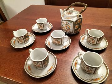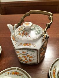 Teiera grande + set di 6 tazzine e 5 piattini (purtroppo uno manca) in porcellana Giapponesi Teiera con manico in ottone