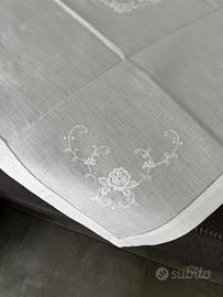 Composto da tovaglia tovaglietta di colore bianco con ricamo fiori rose e margherite centrale e sugli angoli con bordo bucherellato misure 92x89 cm