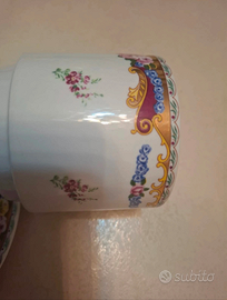 Elegante mini servizio composto da due tazze, due piattini e una zuccheriera in autentica porcellana di Limoges (Francia). Decorato a mano con motivi floreali e dettagli dorati. Senza sbeccature e crepe.