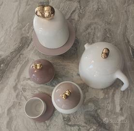 Mr. & Mrs. Love, un servizio completo per accompagnare con eleganza il rituale del tè, composto da teiera, zuccheriera, confettiera, una tazzina, alzatina con cloche per piccola pasticceria. Le forme armoniose e le proporzioni gentili sono enfatizzate dal tipico motivo “a pizzo”, tratto distintivo di Nika Zupanc, che come un orlo decora piattini, teiera e cloche. Le linee arrotondate creano un equilibrio spiritoso col grande cuore in oro posizionato sul coperchio, elemento décor oversize che favorisce anche la presa