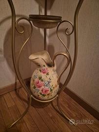 Raffinato complemento d'arredo decorativo in stile shabby chic composto da una struttura di supporto, un lavabo (catino), una brocca, ed uno specchio orientabile. La struttura è realizzata in metallo con finiture dorate, mentre catino e brocca sono in ceramica decorata con motivi floreali.
