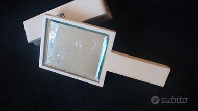 Set da toletta composto da N° 6 elementi, in particolare una bottiglietta per profumo in cristallo con tappo, un portacipria in cristallo con coperchio, due spazzole da capelli, una spazzola da abiti ed uno specchio. Lo specchio è originale ma presenta qualche piccolo difetto. Le iniziali sono "MRM".