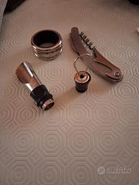 set da vino composto da: Cavatappi a leva, Tappo versatile, Anello salvagoccia, Tappo ermetico
