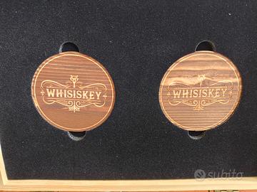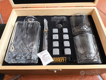 Questo set da whisky per 2 persone, prodotto da Whisiskey, è contenuto in una bella scatola di legno; al suo interno troviamo una caraffa con il tappo, 2 bicchieri con 2 sottobicchieri, 8 pietre refrigeranti e una pinzetta per poterli posizionare nei 2 bicchieri. Il set è nuovo, non è stato mai utilizzato ed è un'ottima idea per fare un regalo.